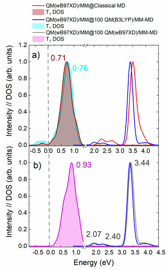 To this aim, we have computed the density of states (DOS) of the lowest-lying triplet excited state of mTHPC using the QM(wB97XD)/MM@100-QM(B3LYP)/MM-MD protocol, which was the one providing the most accurate absorption energies. Figure 5a shows that the lowest-energy triplet-state T1 band presents a portion of its DOS close and below 0 eV. When the sampling is performed by classical MD, there is also a portion of the triplet band falling below zero. The problem of having negative triplet transition energies in TD-DFT calculations [36,48,50] can be partially ascribed to the exchange-correlation functional, where the amount of Hartree-Fock exchange [51] and the range-separated character [49] are the most delicate aspects in this matter. A second source of error in TD-DFT is the adiabatic approximation which assumes an instantaneous reaction of the exchange-correlation potential when the electron density changes in time. It has been shown that this approximation introduces large errors when computing spin-flip transitions, such as S0-T1 transitions, especially when range-separated functionals, for example, wB97XD, are used [49]. Exchange and correlational functionals that present relatively large contributions of the HF exchange have larger probability to display the so-called triplet instability problem, for which the triplet excitation energies approach the zero value [51].