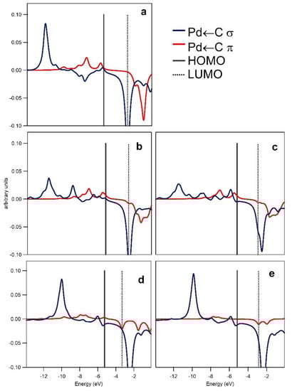 Crystal orbital overlap population (COOP) analysis and inspection of the relevant frontier molecular orbitals provided information on the Pd ← C (σ type; σ) and Pd → C (π type; π) interactions for the fragmentations (a) and (b) and on the PdC ← N (σ type; σ′) interactions for the fragmentation (c), see Figure 2. Overlap integrals for the interacting fragments and relevant populations are given in Table S1 in the Supplementary Material. Results of the COOP analysis depicted in a graphical form in Figure 3 and Figure 4 allow the interpretation of the bonding/anti-bonding nature of the discussed interactions. For the Pd–C bond, σ and π interactions show positive overlaps (bonding type) with the exceptions of the low anti-bonding σ interaction in the −8 to −5 eV energy range for 1. The π interactions give a non-negligible contribution to the Pd–C bond as inferred from the EDA analysis (see Supplementary Material). Finally, the corresponding COOPs for the σ′ interaction, see Figure 4, show very small overlap in agreement with the weak bonding between 1 and indazole in TS6 and TS14.