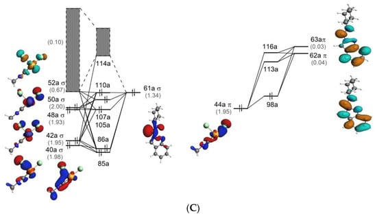 Single-point calculations on the previously optimized geometries of compounds 1, TS6, TS14, Z-P2, and Z-P1 were carried out by using the ADF package [73,74] in the DFT framework, at relativistic scalar ZORA level [75,76,77,78], by using the GGA BP86 functional [79,80,81] and Grimme3 BJ-DAMP dispersion corrections [82,83,84] in conjunction with the Slater-type triple ζ doubly polarized (TZ2P) basis set for all the atoms. Previously, it was shown that the GGA BP86 functional demonstrates very good performance in the analysis of the bonding nature in transition metal complexes [85], in the Voronoi Deformation Density (VDD) analysis [86], and in the Energy Decomposition Analysis (EDA) [87]. The effect of the solvent was taken into account according to the Conductor-like Screening Model (COSMO) formalism [88,89,90,91]. The bond analysis was carried out employing canonical Kohn-Sham molecular orbitals (KS-MO).