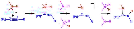 Despite intensive experimental investigations of NA of N-nucleophiles to metal coordinated isocyanides, the mechanism of this addition started to become clear only recently. The experimental kinetic studies [43,62,63] indicated a negative activation entropy for the reaction between amines and isocyanides ligated to the Pt(II) or Pd(II) centers. However, as recently as 2017, it was established by theoretical calculations that the mechanism of NA of amines, imines, and hydrazones (HNMe2, HN=CPh2, and H2N–N=CPh2) to the platinum(II) complexes cis-[Pt(C≡NCy)(2-pyz)(dppe)]+ (2-pyz = 2-pyrazyl, dmpe = Me2PCH2CH2PMe2) and cis-[PtCl2(C≡NXyl)(C≡NMe)] is of the stepwise associative type including an attack of the nucleophile by the NH nitrogen atom at the isocyanide carbon atom followed by the amino or imino proton migration via stepwise deprotonation/protonation steps, as shown in Scheme 1 [64].