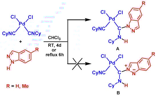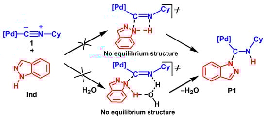 Coupling between aromatic heterocycles with the pyrazole unit and metal-activated isocyanides was reported only recently [65]. The reaction between equimolar amounts of indazole (Ind) or 5-methylindazole and the complex cis-[PdCl2(CNCy)2] (Cy = cyclohexyl) in chloroform yields aminocarbene species A, see Scheme 2. However, details of the mechanism for this reaction were not studied. In particular, the nature of the reaction regioselectivity is unclear. The Indazole molecule has two adjacent imine and amine nucleophilic centers. The former center exhibits stronger nucleophilic properties compared to the latter one. Indeed, in accord with DFT calculations (see Computational Details section), the cationic indazole molecule protonated at the imino N atom is more stable than Ind protonated at the amino nitrogen by 20.8 kcal/mol. Therefore, the preferable formation of a product of the B type, see Scheme 2, would be expected as a result of this reaction but only product A was isolated experimentally from the reaction mixture.