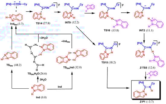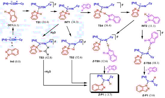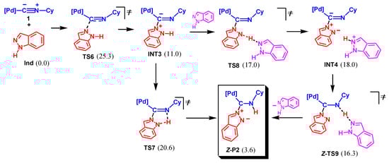 As can be seen from Scheme 5, the proton abstraction step is the rate-limiting step for the whole process with the overall activation barrier of 36.4 kcal/mol (in terms of ΔGs≠). This value is too high to permit the realization of Mechanism I; therefore, the nucleophilic addition of Ind by the amino N atom may be ruled out. Thus, the mechanism of the reaction of indazole with the Pd-bound isocyanides is different from that when amines, imines, and hydrazones are employed as nucleophiles [64].