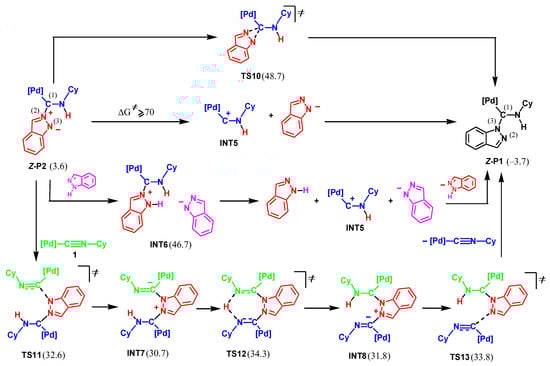 Pathway (iiia). In this and two following pathways, the deprotonation/proton transfer of/from the coordinated indazole precedes the C–N bond formation. The NH proton of indazole may be transferred to the N isocyanide atom via TS18. The calculations demonstrated that such a transfer is accompanied by the C–N bond formation to give INT14, while the acyclic intermediate INT13 does not exist. Complex INT14 is transformed to Z-P1 via TS19. Meanwhile, this pathway has a very high activation energy of 72.2 kcal/mol, thus, it may be excluded.