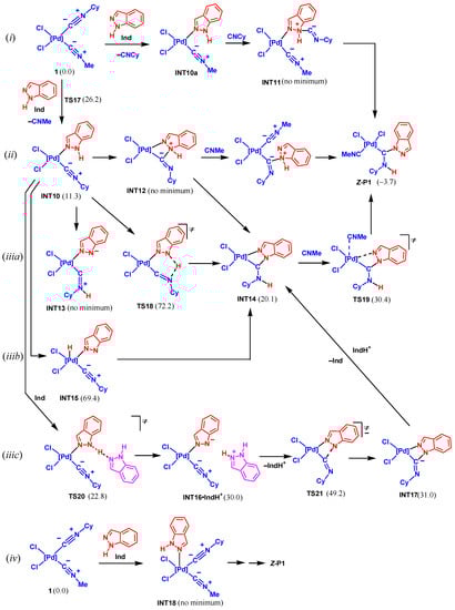 Pathway (iv). This pathway includes the addition of Ind to complex 1 to give the penta-coordinated intermediate INT18. However, the calculations indicated that such an intermediate does not exist. All attempts of its geometry optimization led to the extrusion of Ind to the second coordination sphere. These results are in agreement with those obtained previously for the substitution of the nitrile ligand in complexes trans-[MCl2(NCMe)2] (M = Pd, Pt) [93]. Therefore, all pathways considered in this part are not feasible either because the key intermediates do not exist or due to the very high activation barrier.
