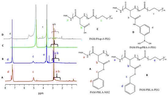 1H-NMR spectra of (A) PAM-PBLA480-NH2, (B) PAM-PBLA480-b-(PEG45)30, (C) PAM-PAsp480-b-(PEG45)30, and (D) PAM-(Asp0.29-co-AspPBA0.71)480-b-(PEG45)30.