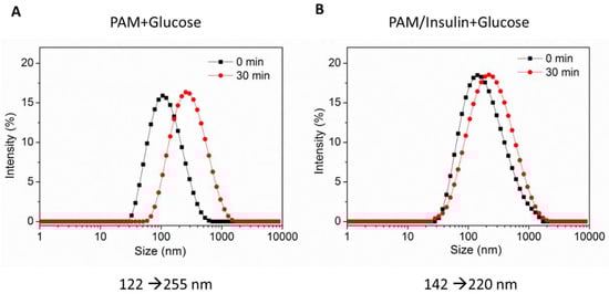 Changes of sizes of PAM-PAspPBA-b-PEG and insulin-loaded PAM-PAspPBA-b-PEG after adding glucose determined by DLS. PAM-PAspPBA-b-PEG (A) and insulin-loaded PAM-PAspPBA-b-PEG (B) dissolved in 20 mM glucose solution (PBS, pH = 7.4) at 0 min and 30 min.