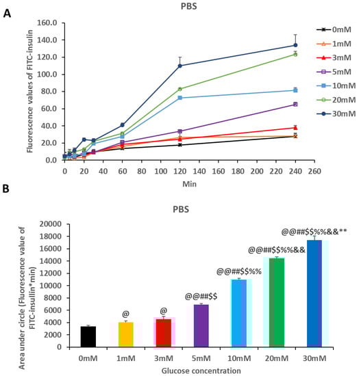 Insulin release in PBS (A) with different glucose concentrations. Area under circles of fluorescence values of fluorescein isothiocyanate (FITC)-insulin with different glucose concentrations within 240 min were calculated by the formulation ‘[(F0 + F5) × 5 + (F5 + F10) × 5 + (F10 + F20) × 10 + (F20 + F30) × 10 + (F30 + F60) × 30 + (F60 + F120) × 60 + (F120 + F240) × 120] × 1/2; Fn, Fluorescence value at n min, n = 0, 5, 10, 20, 30, 60, 120 or 240]’, respectively (B). FITC-insulin loaded PAM-PAspPBA-b-PEG dissolved in PBS (pH 7.4) with 0, 1, 3, 5, 10, 20 or 30 mM final glucose concentration. The experiment is repeated thrice. Data were represented as mean ± S.D.; @P < 0.05, @@P < 0.01 vs. 0 mM; ##P < 0.01 vs. 1 mM; $$P < 0.01 vs. 3 mM; %%P < 0.01 vs. 5 mM; &&P < 0.01 vs. 10 mM; **P < 0.01 vs. 20 mM.
