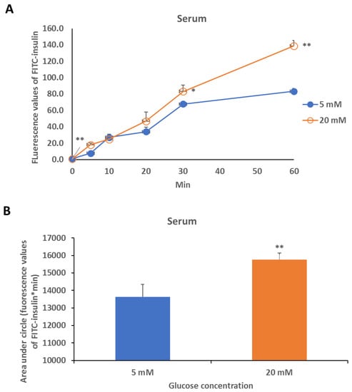 Furthermore, we used phosphate buffer saline (PBS) and fetal bovine serum (FBS) that contained different glucose concentrations (0–30 mM), and we determined that the insulin release in the solutions. We found that glucose dramatically increased insulin release in PBS solution contained glucose almost in a dose-dependent manner (Figure 4A,B). Also, high concentration of glucose showed a significant increase in insulin release in the serum compared with the low concentration of glucose (Figure 5A,B).