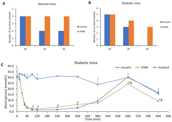 Male NIH mice (4-week old) were purchased from Guangdong Medical Animal Center (Guangzhou, China). The animals were kept at a room with temperature 20 ± 2 °C, humidity 60% ± 5%, and 12 h dark/light cycle. All experiments were strictly in accordance with the recommendations of the Guide for the Care and Use of Laboratory Animals of the Institutional Animal Care and Use Committee of Tsinghua University (No.17-lf1#). For the safety assay, after acclimation for two weeks, the normal animals were randomly divided into two groups (four mice per group). The first group was subcutaneously injected with insulin-loaded PAM-PAspPBA-b-PEG that contained 1.2 mg/kg insulin. The second group was subcutaneously injected with pure insulin at a dosage of 1.2 mg/kg. The normal animals were analyzed in a fasting condition. The number of animal survivals was recorded after 2 and 4 h of injection. For diabetic mice, after acclimation for one week, diabetes was induced in mice fasting for 24 h by intraperitoneal injection of streptozotocin (Sigma-Aldrich, St. Louis, MO, USA; 100 mg/kg) according to the previous method []. After a week, mice with blood glucose over 11.1 mmol/L were selected as the diabetic model and subjected into further investigation. The protocol of the safety assay in diabetic mice (five mice per group) was similar to that in normal mice.