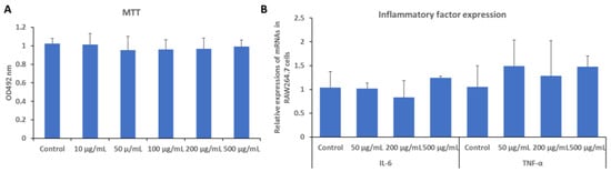 Cytotoxicity assay (A) by MTT method and inflammatory factor expressions (B) by RT-PCR analysis in RAW264.7 cells.