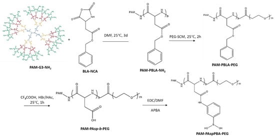 Fourth, PAM-PAspPBA-b-PEG was synthesized by amidation reaction between PAM-PAsp-b-PEG and APBA. Briefly, PAM-PAsp-b-PEG (0.5 g) and APBA (0.305 g) were dissolved in DMF (10 mL). EDC (2 g) was added to the solution. The mixture solution was magnetically stirred for 4 h at 4 °C. Subsequently, a 10-fold volume of deionized water (pH = 3) was added, and the precipitate was isolated by centrifugation at 3000 rpm for 10 min. The precipitate was washed with deionized water (pH 7.0) and was lyophilized to obtain PAM-PAspPBA-b-PEG. The synthesis scheme of PAM-PAspPBA-b-PEG is summarized in Scheme 1.