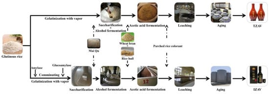There are mainly two vinegar manufacturing methods: the traditional method and the industrial method. The traditional method is a slow and complicated fermentation process, which are controlled empirically to facilitate microbial growth and accumulation of components in vinegar. The industrial method is a mechanical and fast production procedure. Advanced techniques and equipment are used in the industrial method, which can improve productivity and reduce production cost. Traditional Zhenjiang aromatic vinegar (TZAV) and industrial Zhenjiang aromatic vinegar (IZAV) are produced by these two production methods (Figure 1). With a mixture of cooked glutinous rice and unique Mai Qu in ceramic pots, starch saccharification and alcohol fermentation of TZAV are performed simultaneously. The acetic acid fermentation procedure requires experienced technicians turning over the Pei regularly. After leaching and decoction, TZAV is sealed and stored in ceramic pots on spacious ground for aging. In another manufacturing method, the raw materials of IZAV are crushed and cooked. Starch saccharification is accelerated by glucoamylase and then followed by alcohol fermentation in a large fermentation tank [,]. Subsequently, an automatic machine is used to turn over the Pei during acetic acid fermentation. Leaching and decoction are performed by equipment, and aging is conducted with mechanical devices in large jars []. Several authors have studied the characteristics of liquid-state fermentation vinegars, such as balsamic vinegar and grape wine vinegar, which are produced by two kinds of techniques (the traditional method and the industrial method). The two kinds of vinegars can be discriminated according to their chemical compositions and functional properties [,,,,,,]. However, the differences in compositions and properties of solid-state fermentation vinegars, which were produced by traditional and industrial methods, have been rarely explored.