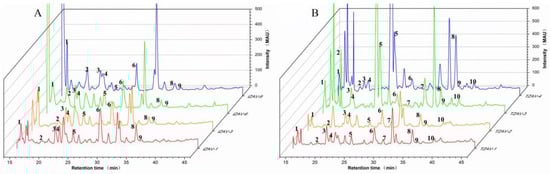 High-performance liquid chromatography (HPLC) chromatograms (recorded at 278 nm) of IZAV (A) and TZAV (B) samples showing the major phenolic compounds. Numbers represent different phenolic compounds (1: P-hydroxybenzoic acid; 2: chlorogenic acid; 3: caffeic acid; 4: vanillic acid; 5: syringic acid; 6: catechin; 7: p-coumaric acid; 8: ferulic acid; 9: sinapic acid; 10: rutin).