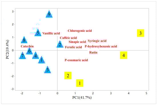 Principal component analysis (PCA) biplot displayed associations between phenolic compositions and two kinds of ZAV samples. Blue triangles represent IZAV and yellow squares represent TZAV.