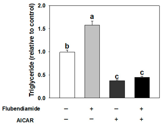 AICAR (5-Aminoimidazole-4-carboxamide ribonucleotide) abolished the increased fat accumulation induced by flubendiamide. Cells were treated with flubendiamide (10 μM) or AICAR (40 μM) for 8 days. Each value is expressed as the mean ± standard error of three separate experiments. Means with different letters were significantly different at p < 0.05 (a vs. b, a vs. c or b vs. c are significantly different).