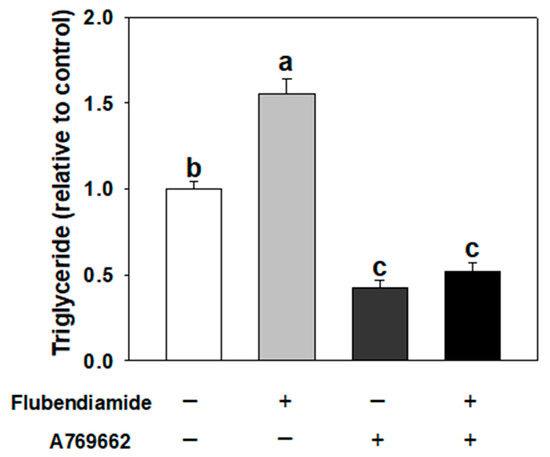 A769662 abolished the increased fat accumulation induced by flubendiamide. Cells were treated with flubendiamide (10 μM) or A769662 (10 μM) for 8 days. Each value is expressed as the mean ± standard error of three separate experiments. Means with different letters were significantly different at p < 0.05 (a vs. b, a vs. c or b vs. c are significantly different).