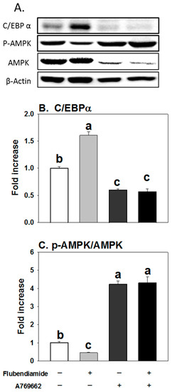 A769662, a potent activator of AMPK [14,22], was further utilized to investigate the effects of AMPK activation on increased adipogenesis by flubendiamide. As shown in Figure 5, when cells were co-treated with A769662 and flubendiamide, A769662 decreased the fat accumulation induced by flubendiamide, compared to the flubendiamide treatment alone. Similarly, increased protein expression of C/EBPα and decreased expression of pAMPKα induced by flubendiamide were abolished by A769662 (Figure 6A–C). These results suggest that AMPKα activation abolished enhanced adipogenesis induced by flubendiamide.