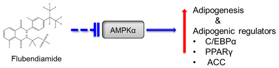 Flubendiamide (10 µM) significantly increased expression of two key proteins regulating adipocyte differentiation, cytosine-cytosine-adenosine-adenosine-thymidine (CCAAT)/enhancer-binding protein α (C/EBPα) and peroxisome proliferator-activated receptor gamma (PPARγ), compared to the control (Figure 2B,C). AMPKα is a master regulator of energy production and lipid metabolism in the cell [18] and is activated by phosphorylation of threonine 172 (Thr172) [19,20]. Flubendiamide (10 µM) treatment significantly decreased the phosphorylation of AMPKα and its downstream target (Figure 2D,E). These results suggest that flubendiamide promotes adipocyte differentiation and lipogenesis, contributing to increased lipid accumulation at 10 µM.