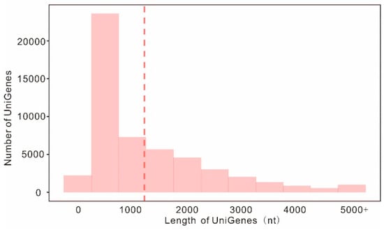 Length distribution of assembled genes. Genes with lengths larger than 5 kb are counted together. The dashed line represents average length of all unigenes.