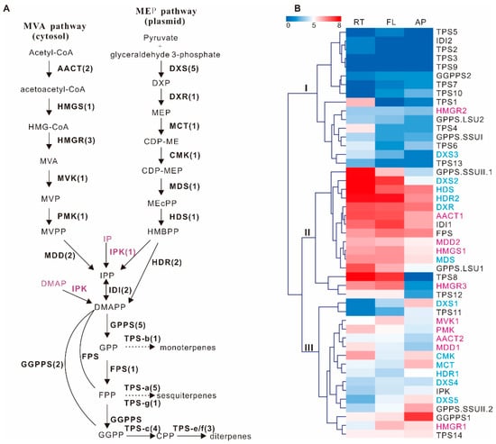 Schematics of the putative terpenoid biosynthetic pathway and the expression level of identified genes from S. barbata. (A) the putative terpenoid biosynthetic pathway in S. barbata. Numbers in the brackets indicate the gene family numbers of each enzyme. (B) a clustered heat map for the 33 terpenoid backbone genes and 14 TPS genes with log-2 transformed FPKM value in root (RT), flower (FL), and aerial parts (AP). Purple marked enzymes are involved in the MVA pathway, and blue marked enzymes are involved in the MEP pathway. The newly identified enzyme IPK in alternative MVA pathway is highlighted in purple. Abbreviations: AACT, aceto-acetyl-CoA thiolase; CMK, 4-(cytidine 5′-diphospho)-2-C-methyl-d-erythritol kinase; DXS, 1-deoxy-d-xylulose 5-phosphate synthase; DXR, 1-deoxy-d-xylulose-5-phosphate reductoisomerase; FPS, Farnesyl pyrophosphate synthase; HDR, (E)-4-hydroxy-3-methylbut-2-enyl diphosphate reductase; HDS, (E)-4-hydroxy-3-methylbut-2-enyl diphosphate synthase; HMGS, 3-hydroxy-3-methylglutaryl-CoA synthase; HMGR, 3-hydroxy-3-methylglutaryl-CoA reductase; GGPPS, Geranylgeranyl pyrophosphate synthase; MCT, 2-C-methyl-d-erythritol 4-phosphate cytidylyltransferase; IDI, Isopentenyl diphosphate isomerase; IPK, Isopentenyl phosphate kinase; MDS,2-C-methyl-d-erythritol 2,4-cyclodiphosphate synthase; MDD, Mevalonate diphosphate decarboxylase; MDS, 2-C-methyl-d-erythritol 2,4-cyclodiphosphate synthase; MVK, mevalonate kinase; Phos, phosphatase(s); PMK, phosphomevalonate kinase; TPS, terpene synthases (including monoterpene synthases and sesquiterpene synthases); CPS, copalyl diphosphate synthase; KSL, Kaurene synthase. (A) shows (B) shows.