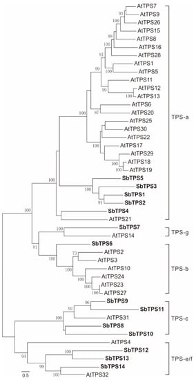 SbTPS6 was resolved in the TPS-b clade, which usually contains monoterpene synthases [36]. SbTPS6 did not cluster with any of the TPS-b subfamily genes in A. thaliana. SbTPS7 clustered with S-linalool synthase (AtTPS14) in Arabidopsis, which is in the TPS-g subfamily. SbTPS8 to SbTPS11 clustered with ent-copalyl diphosphate synthase (AtTPS31) in A. thaliana, forming the TPS-c clade. Three TPS, SbTPS12 to SbTPS14, clustered with ent-kaurene synthase (AtTPS32), which were part of TPSe/f clade (Figure 4; [36]). Despite the small gene families of TPS-a and b, S. barbata has a relatively large gene family in TPS-c and the TPS-e/f subfamily, which will generate structural backbones of the abundant diterpenoids in S. barbata.