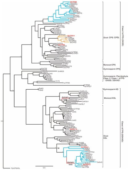 Phylogeny of S. barbata diterpene synthases. The maximum likelihood tree illustrates the phylogenetic relationship of S. barbata diterpene synthases with 127 representative characterized diTPS (Table S7). Physcomitrella patens CPS/kaurene (PpCPSKS) was used as an outgroup. Branches with >80% bootstrap support are indicated with an asterisk. Blue lines show diTPS genes from Lamiaceae involved in normal-CPP/LDPP-mediated diterpenoid metabolism and red lines show the loss of the N-terminal γ domain found in eudicot and monocot KSLs. Yellow lines show genes from Lamiaceae involved in the specialized ent-CPP/LDPP related diterpenoid metabolism. Red-marked enzymes show diTPS from S. barbata in this study.