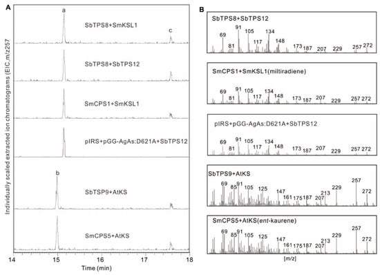Furthermore, SbTPS12 was found to produce miltiradiene when combined with SbTPS8 (Figure 6), thus SbTPS12 was identified to be a miltiradiene synthase in S. barbata. However, KSL from different origins were found to have extreme promiscuity [34,39,40]. Thus, to probe the substrate promiscuity of SbTPS12, a previously reported modular metabolic engineering system was utilized [40,41]. This system enables facile co-expression of CPSs and KSLs in E. coli with high production. Twelve different class II diterpene cyclases with varied product outcomes [40] were assembled into the metabolic engineering system for co-expression with SbTPS12. As expected, SbTPS12 co-expressed with copalyl diphosphate synthase produced the same product of miltiradiene with an in vitro assay. No obvious stable activity was found with the other 11 class II diTPS synthases.