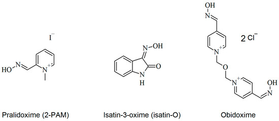The treatment for OPs poisoning is based on the administration of some drugs combined: an anticholinergic agent (e.g., atropine), an anticonvulsant drug (e.g., diazepam) and a mono- or bispyridinium AChE reactivator (e.g., pralidoxime, obidoxime, or trimedoxime) [3]. Extensive studies have investigated the mechanism of action of the oxime group in the reactivation of AChE inhibited by OPs [4,5,6,7,8,9,10,11,12,13,14,15,16,17]. Due to its structural and molecular properties, oximes are considered the most potent reactivators for AChE inhibited by OPs up to the present moment. The high affinity for AChE and nucleophilicity of these compounds allows the displacement of the OP from the catalytic site, enabling the reactivation of AChE. Pralidoxime (2-PAM) (Figure 1) is a monoquaternary oxime and one of the most employed as antidote today, although research indicates that bisquaternary oximes are more effective in the reactivation process [18]. 2-PAM is commonly used in the United States, while bispyridinium oximes, such as obidoxime (Figure 1), are used in European countries [19].