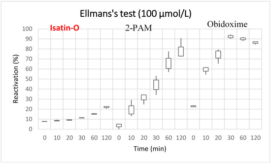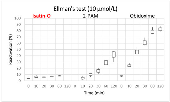 Figure 3 and Figure 4 present the results of the reactivation tests for isatin-O, 2-PAM and obidoxime, at concentrations of 10 and 100 μmol/L respectively.