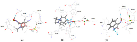 Obidoxime presented the highest number of H-bond interactions, probably due to the two oximate groups present on its structure. Results for the O(oxime)-P(POX) distance, intermolecular and H-bond energies, and residues of interaction, point to this oxime as the best reactivator, followed by isatin-O, and finally 2-PAM. This is in corroboration with the better reactivation results presented by obidoxime, and suggest that isatin-O is a potential reactivator for AChE/POX. However, after 10 min, 2-PAM presented better reactivation results than isatin-O. This fact may occur due to the interaction of 2-PAM with one of the residues of the catalytic triad, His447, and also because 2-PAM is a positively charged molecule, a fact that favors interactions in the active site and, in consequence, the stabilization of the compound inside the enzyme. Figure 6 shows the best poses for isatin-O, obidoxime and 2-PAM. These poses were selected using the MCDM [49,50,51] hybrid method TOPSIS-AHP [52,53,54,55,56,57].