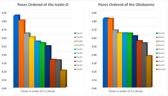 All calculations described in the methodology for the evaluation of poses were done using the TOPSIS method [52,53,54,55] with spreadsheets elaborated in excel software©. Figure 7 shows the results of the similarity coefficient calculations, for s = 2, of isatin-O and obidoxime. It was thus possible to select the best pose for each molecule, since the MCDM method employed generates, as a result, ordered poses, from the closest to the most distant solution, allowing the identification of the ideal solution. As 2-PAM was submitted to redocking, with its conformation present in the crystalline structure removed from the PDB, it was not necessary to carry out the selection of pose calculations, since, in this case, the selection met the redocking criterion. The best poses of each oxime studied were selected, as presented in Table 2 and Figure 6 and Figure 7, and then used in the further molecular dynamic simulations.