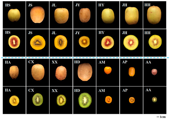 Morphological characteristics of representative kiwifruits collected in China. HS, Actinidia chinensis cv. Hongshi; JS, A. chinensis cv. Jinshi; JL, A. chinensis cv. Jinlong; HY, A. chinensis cv. Hongyang; JH, A. chinensis cv. Jinhong; HH, A. chinensis cv. Honghua; HA, A. chinensis cv. Hort16A; CX, A. deliciosa cv. Cuixiang; XX, A. deliciosa cv. Xuxiang; HD, A. deliciosa cv. Hayward; AM, A. macrosperma; AP, A. polygama; AA, A. arguta.