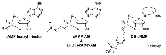 First reports on phosphate-protected cNMPs by Gillen and Nagyvary on alkyl phosphotriesters of cAMP were followed by Engels et al. who prepared cAMP and cGMP derivatives carrying different benzyl groups including photo-cleavable moieties at the phosphate (Figure 1) [8,9,10,11]. Hughes et al. reported the synthesis and biologic evaluation of N6,O2-dibutyryl cAMP-acetoxymethyl (AM) ester (Figure 1) [12]. The synthesis started from N6,O2′-dibutyryl cAMP, which was converted with AM bromide (AM-Br) under DIEA-basic conditions in CH3CN over 4 days at room temperature (rt) to give the desired product in low yield after demanding chromatography [12]. The obtained masked nucleotide was used in whole-cell incubation studies where an activation of PKA proceeded, but only 15 min after the addition of di(Bu)cAMP-AM (10 µM) to the cell medium [12]. In a further study, Schultz et al. synthesized cAMP-AM [13]. Despite a PKA activating effect of cAMP-AM, the researchers found that cAMP-AM was less potent than di(Bu)cAMP-AM and was metabolized so rapidly that it gave only transient signals [13]. The synthesis of AM-esters of cCMP and cUMP has also been reported [14]. However, cNMP-AMs are in our experience not applicable for all cell types, seemingly due to their insufficient chemical stability. Further, the variability of the described synthesis approaches, which started from the respective cNMP, is limited by the availability of these.