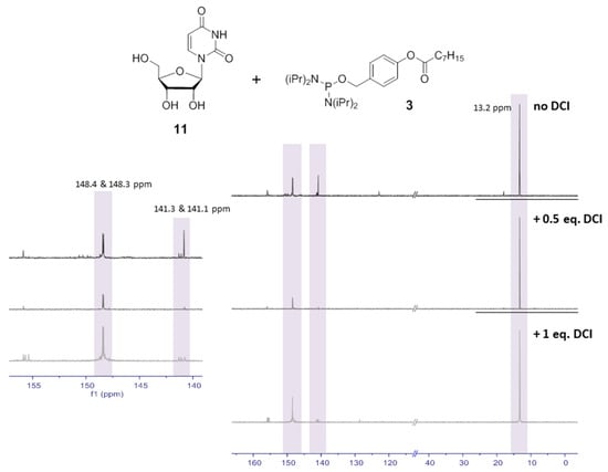 Prompted by the surprisingly low yield, the reaction course was studied 31P-NMR spectroscopically (Figure 2). Interestingly, upon just mixing uridine 11 and OBPA2 3, the diamidite was converted almost quantitatively and a signal at 13.2 ppm formed (Figure 2). Comparison with literature-data indicated that this signal likely corresponded to an activated amidite [26]. Furthermore, signals in the range of phosphoramidites (148.4 & 148.3 ppm) and phosphites (141.3 & 141.1 ppm) were formed already as well (Figure 2, top). The addition of DCI then promoted the formation of the intermediate phosphoramidite (middle and bottom), but formation of the anticipated cyclic phosphite seemed to occur only at low proportion. Steric hindrance in the attack of the 3′-hydroxy group on the phosphorous atom or an insufficient nucleophilicity may be the reasons that led to an insufficient formation of the cyclic phosphite.