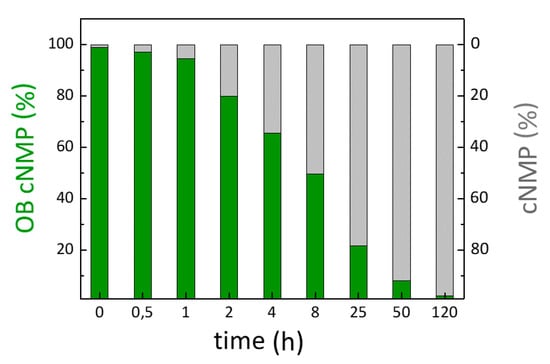 It was found that after approximately 8 h, 50% of the OB-cNMPs were hydrolyzed (10: t½ = 8.6 h, 12: t½ = 7.4 h, 13: t½ = 7.5 h) (Figure 3). This half-life implied a stability of the OB-cNMPs that should facilitate convenient setups of cell-based assays and allow experimental set-ups to run, for example, even (pre-)incubation experiments with the masked nucleotides. The hydrolysis behavior of 10, 12, and 13 was assessed further, and the relative areas of signals for OB-cNMP and cNMP were determined (in percent). These values were normalized and then averaged for all three hydrolyses under determination of their standard deviation. By this procedure, the individual hydrolysis courses were compared with another since the progress of hydrolyses was expected to be similar as the dissociation of the OB-mask should constitute the determinant process.