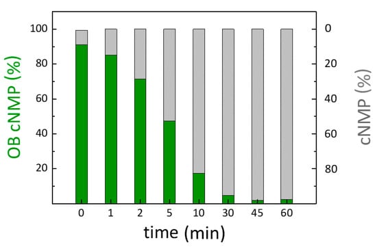 The average deviation of the hydrolysis progress for OB-cNMPs 10, 12, and 13 at the time points measured was 5% with a single value maximum of 12%. From these calculations, it was deduced that the hydrolysis course was indeed analog for all OB-cNMPs tested and subject to the pace of the cleavage of the masking group and was almost independent of the nucleotide.