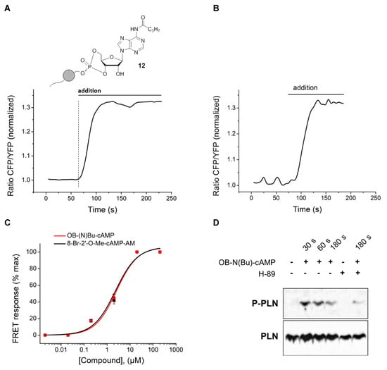 Primary mouse cardiomyocytes carrying a FRET-sensor with a cAMP binding site were used to examine the membrane-permeability of OB-N(Bu)-cAMP 12 in particular. The binding of intracellular cAMP to the FRET sensor is indicated by a decreasing FRET-signal and an increasing fluorescence ratio between cyan-fluorescent protein (CFP) and yellow-fluorescent protein (YFP) [28]. FRET-sensors carrying mouse cardiomyocytes were incubated with OB-N(Bu)-cAMP 12 (20 mM DMSO stock sol., 20 µM final conc. in DMSO/buffer, at t ≈ 60 s) (Figure 7A,B). Immediately after addition of 12 to the extracellular medium, the ratio between CFP and YFP started to increase and reached a steady maximum state at circa 50 s (Figure 7A) which was comparable with the previously well-established cell permeable cAMP analogue 8-Br-2′-O-Me-cAMP-AM (Figure 7B) (Figure 7A,B) [28]. Likewise, the concentration–response dependencies were largely comparable for both analogues and reached the maximum at 20 µM (Figure 7C). These results imply that OB-N(Bu)-cAMP 12 instantaneously crossed the cell membrane and was also rapidly activated by intracellular esterases. Further, the product of the activation process was successfully recognized by the cAMP binding site of the FRET sensor. For the studied substrate, OB-N(Bu)-cAMP 12, this implicated that the N6-butyryl group was either removed by enzymatic hydrolysis, or that its presence had no detrimental effect on the FRET biosensor interaction. Indeed, as expected from 6-monobutyryl derivatives of cAMP, incubation of cardiomyocytes with 12 led to almost instantaneous of phospholamban phosphorylation by the cAMP dependent protein kinase (Figure 7D). These immunoblots suggest that OB-N(Bu)-cAMP might activate phospholamban phosphorylation in a reversible manner. It can be expected from the chemical structure of 6-N(Bu)-cAMP that it should be degradable by intramolecular phosphodiesterases, in a way that high activity of these enzymes in cardiomyocytes leads to a gradual decline of cAMP dependent protein kinase substrate phosphorylated over time.