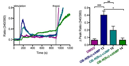 Stimulation of the of Jurkat T cells with OB-cNMPs 10, 12, and 13. Left: Jurkat T cells were stimulated after 120 s with the respective OB-cNMPs (20 µM) or DMSO (as negative control). Furthermore, as positive control Thapsigagarin (1.67 µM) was added after 900 s. Mean signal ratio between 340 nm and 380 nm from single cells are shown (DMSO n = 26; OB cAMP n = 77; OB cUMP n = 37; OB c(dAMP) n = 14). The addition of 12 and 10 resulted in a transient increase of the Ca2+ concentration, while no transient increase is visible for 13 or DMSO. Right: Statistical analysis of the mean delta peak for the OB-cNMPs and DMSO (data represent mean ± SEM). The most pronounced effect is measured for 12 and statistically significant differences between are marked by asterisks (* p < 0.05, ** p < 0.01, *** p < 0.001, Kruskal–Wallis Test).
