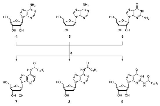 Synthesis of N-butyryl nucleosides 7–9: a. first 2.1–9.0 equiv. TMSCl, 0 °C to rt, 18 h, second 1.1 equiv. butanoyl chloride, pyridine/THF or pyridine/CH2Cl2, rt, 5–18 h, third 1 M aq. HCl or CH3OH, rt, 5 min or 18 h, 7: 61%, 8: 32%, 9: 48%.