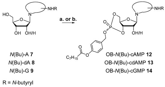 The nucleosides adenosine (A, 4), 2′-deoxyadenosine (dA, 5), and guanosine (G, 6) were mono-N-butyrylated to add further lipophilicity to the envisaged OB-cNMPs. N6-Butanoyl-adenosine 7 was synthesized starting from adenosine 4 via transient silylation of all hydroxy-groups to selectively introduce the butyryl moiety at the N6-position [25]. The desired protected nucleoside 7 was obtained in 61% yield after automated RP flash column chromatography following the procedure described in the literature [25]. The yield was limited by the formation of N,N-diacylated adenosine and partial cleavage of the glycosidic bond during concentration of the crude reaction mixture. Analogously, N6-butanoyl-dA 8 and N2-butanoyl-G 9 were synthesized starting from the respective nucleosides and obtained in yields of 32% and 48%, respectively (Scheme 2).