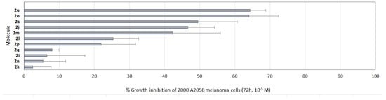 Some of the synthesized compounds were tested [44] for their antiproliferative activity in A2058 melanoma cells and proved to exert a modest to good activity (Figure 2). The best results were obtained with the 4-(trifluoromethyl)benzaldehyde hydrazone 2u and the 8-benzylamino pyrido[2,3-b]pyrazine 2o which induced ~64% growth inhibition at 10−5 M.