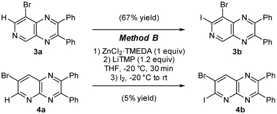 The deprotometalation-iodination sequence was successfully applied to 8-bromo-2,3-diphenyl pyrido[3,4-b]pyrazine (3a) [25,26], but failed with 7-bromo-2,3-diphenylpyrido[2,3-b]pyrazine (4a) due to significant degradation before trapping (Scheme 1). While the position of the iodo group in 3b was evidenced by subsequent reaction, it was studied by advanced NMR experiments in the case of 4b (see Supplementary Materials).