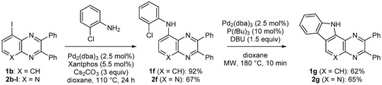 The first step, attempted from 1b by using catalytic palladium(II) acetate as transition metal source, Xantphos as ligand, and sodium tert-butoxide as base in toluene [39], yielded only 16% of diarylamine 1f. Applying to 1b and 2b-I the conditions reported by Maes and co-workers for related reactions [29], 1f and 2f were obtained in 92 and 67% yield, respectively (Scheme 2, left). Inspired by Pieters and co-workers, who cyclized 4-(2-chlorophenylamino)pyridine into 5H-pyrido[4,3-b]indole under these conditions [40], we successfully employed catalytic (Pd2(dba)3) and tri-tert-butylphosphine as catalyst precursors, diazabicyclo[5.4.0]undec-7-ene (DBU) as base, and dioxane as solvent for the second step. After 10 min at 180 °C under microwave irradiation, the pyrazino-fused carbazole 1g and γ-carboline 2g were isolated in moderate yields (Scheme 2, right).