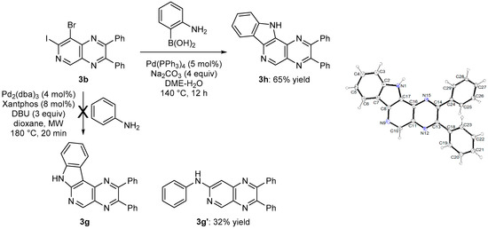 We applied the optimized procedure to the synthesis of the pyrazino-fused α-carboline 3g from the bromoiodo substrate 3b and aniline. No trace of the expected product 3g was detected but the formation of 3g′ due to competitive debromination was noted, showing a less obvious intramolecular C-H arylation (Scheme 3, left). Consequently, we moved to the synthesis of the pyrazino-fused δ-carboline 3h. Upon treatment of 3b by 2-aminophenylboronic acid under standard conditions [29], coupling and subsequent cyclization occurred, providing 3h in 65% yield (Scheme 3, right).