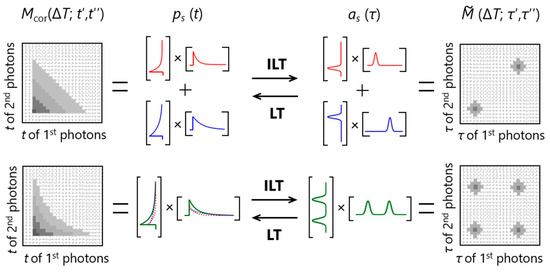 Figure 3. Relationships among a 2D emission-delay correlation map (McorT; t′, t′′)), a 2D lifetime correlation map ( M ˜ ( Δ T ; τ , τ ) ), and the fluorescence decay curves (ps (t)) and lifetime distributions (as (τ)) of independent species. ILT and LT denote inverse Laplace transform and Laplace transform, respectively.