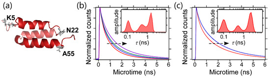 Figure 6. (a) NMR structure of B domain of protein A (PDB ID: 1SS1). The residues that were mutated to cysteine are shown by sticks. (b) Fluorescence decay curves of the FRET donor in the native state of K5C/Y15F/A55C mutant of BdpA at 1.0 (red), 2.0 (blue), 2.5 (green), and 3.0 M (purple) of guanidium hydrochloride (GdmCl). The corresponding independent lifetime distribution at 2.0 M GdmCl is also shown in the figure. (c) Fluorescence decay curves of the FRET donor in the unfolded state of Y15F/N22C/A55C mutant of BdpA at 2.0 (red) and 4.0 M (blue) of GdmCl. The corresponding independent lifetime distribution at 2.0 M GdmCl is also shown in the figure. In (b,c), these decay curves were obtained by performing a global 2D MEM analysis on the 2D emission-delay correlation maps at ΔT = 1–20, 50–100, and 400–600 µs. The arrows in (b,c) represent the shift of fluorescence decay curves with increasing GdmCl concentration. Adapted with permission from Ref. [44] Copyright 2017, American Chemical Society.