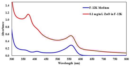 Figure 1 displays the UV-visible spectra of the controls used: Ham’s F-12K and 0.1 mg/mL ZnO in the F-12K medium. Nanoparticles tend to scatter the light when they are analyzed by UV-Visible spectroscopy, which shifted the baseline upward. The baseline shift was taken into account when determining the absorbance at λmax. The λmax of the 0.1 mg/mL ZnO solution was determined to be at 372 nm. The absorbance at the wavelength was calculated by subtracting the absorbance at 390 nm from the absorbance at the highest peak. Ham’s F-12K was also analyzed and its λmax was found to be around 550 nm.