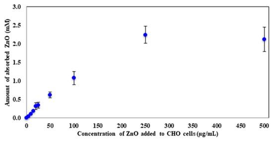 Figure 3). A steady increase in the amount of absorbed ZnO with an increase in dosage was observed. As expected, the absorption reaches a plateau when large concentrations of ZnO are present, indicating the possibility that the at least 250 µg/mL ZnO cause CHO-K1 cells to become saturated and no longer absorb or uptake the nanoparticles. The maximum amount these mammalian cells absorbed was 2.2 ± 0.2 mM ZnO. The 250 µg/mL sample had an initial concentration of 3.1 mM; therefore, around 70% of the ZnO nanoparticles were absorbed by the cells at this concentration. For the 500 µg/mL sample, 6.2 mM was the starting concentration of ZnO, which corresponds to around 35% absorption.