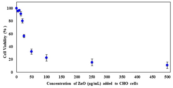 Figure 5 shows the percent viability curve from 0–500 µg/mL ZnO after cell incubation in the presence of different amounts of nanoparticle for 24 h at 37 °C with 5% CO