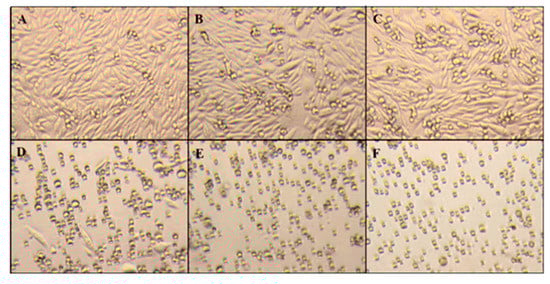 Figure 6 shows the microscopy images of the culture flasks using an inverted microscope. The different panels represent typical behavior under different ZnO amounts. Images indicate that the morphology of CHO-K1 cells was directly impacted as the concentration of ZnO present increased. At concentrations of 20 µg/mL ZnO and below, the cells were able to maintain their natural adherent behavior. At 25 µg/mL of ZnO, some CHO cells were able to maintain the adherent morphology, but the majority of the cell culture expressed a round physiology. However, at amounts exceeding 25 µg/mL ZnO, the CHO-K1 cells stayed in the media and grew similar to suspension cells and stayed circular in form.